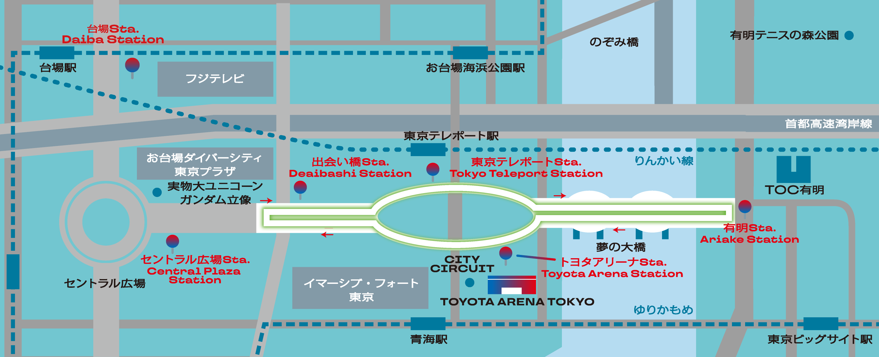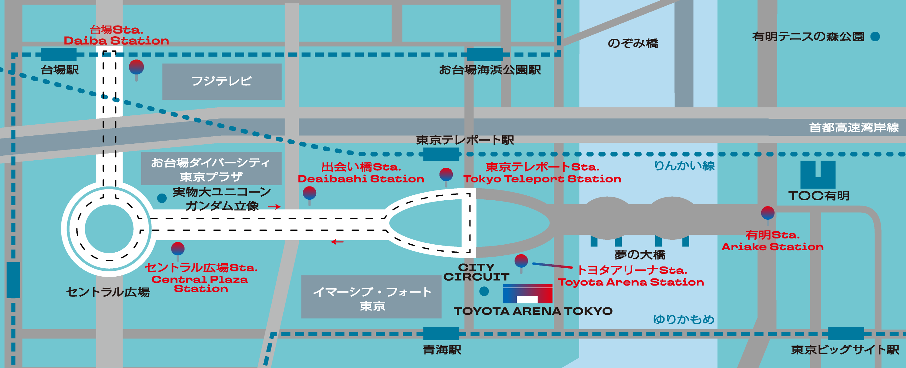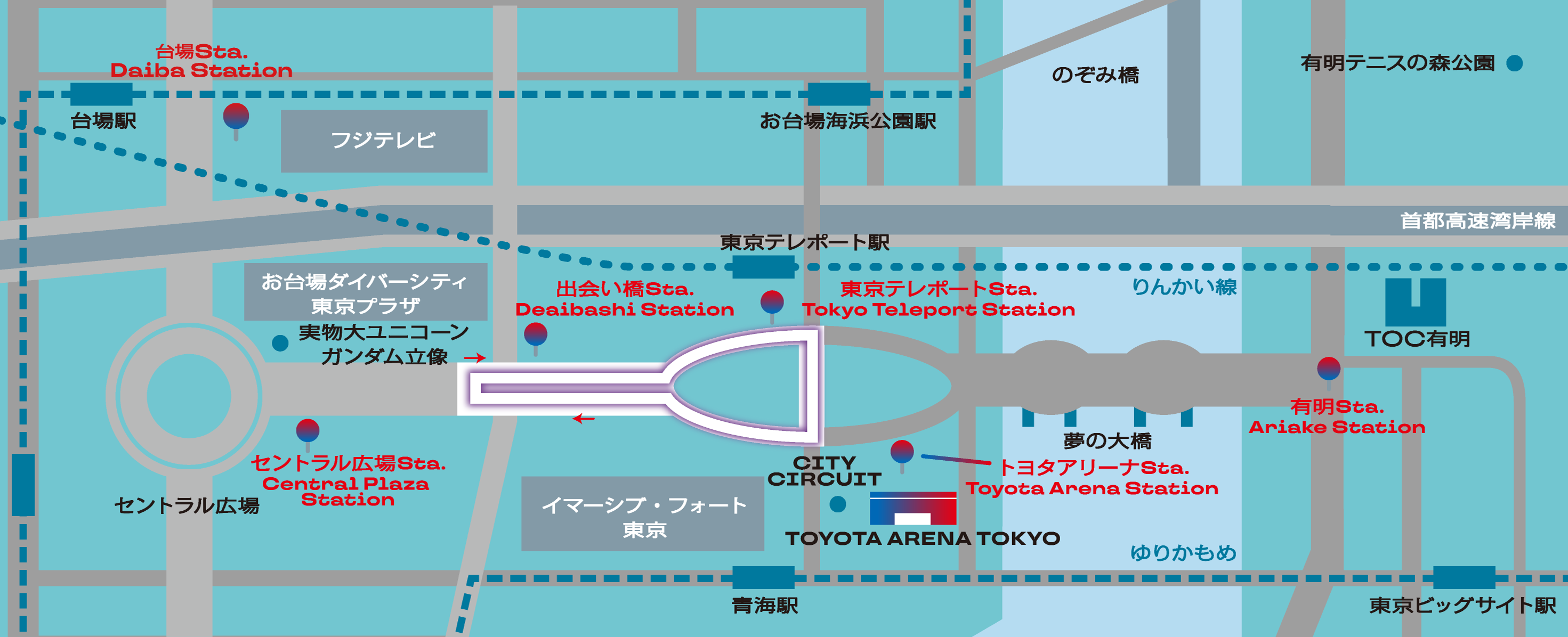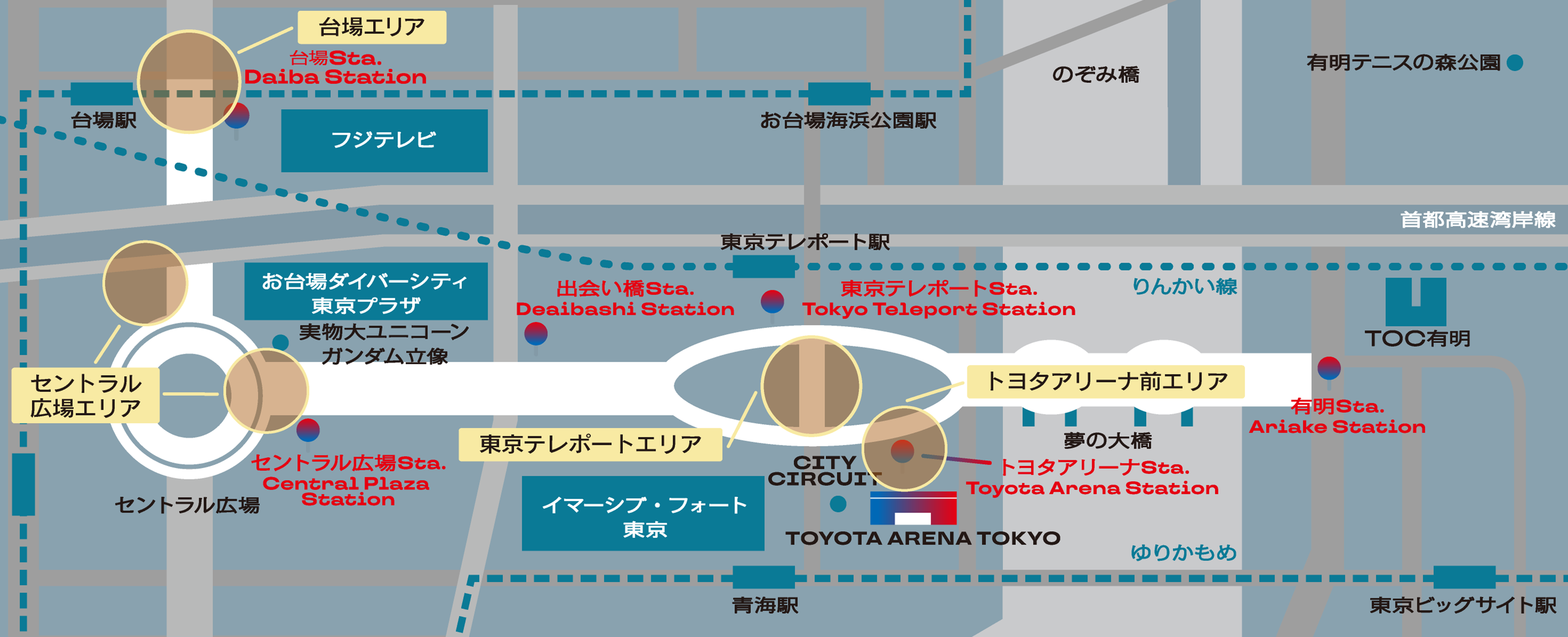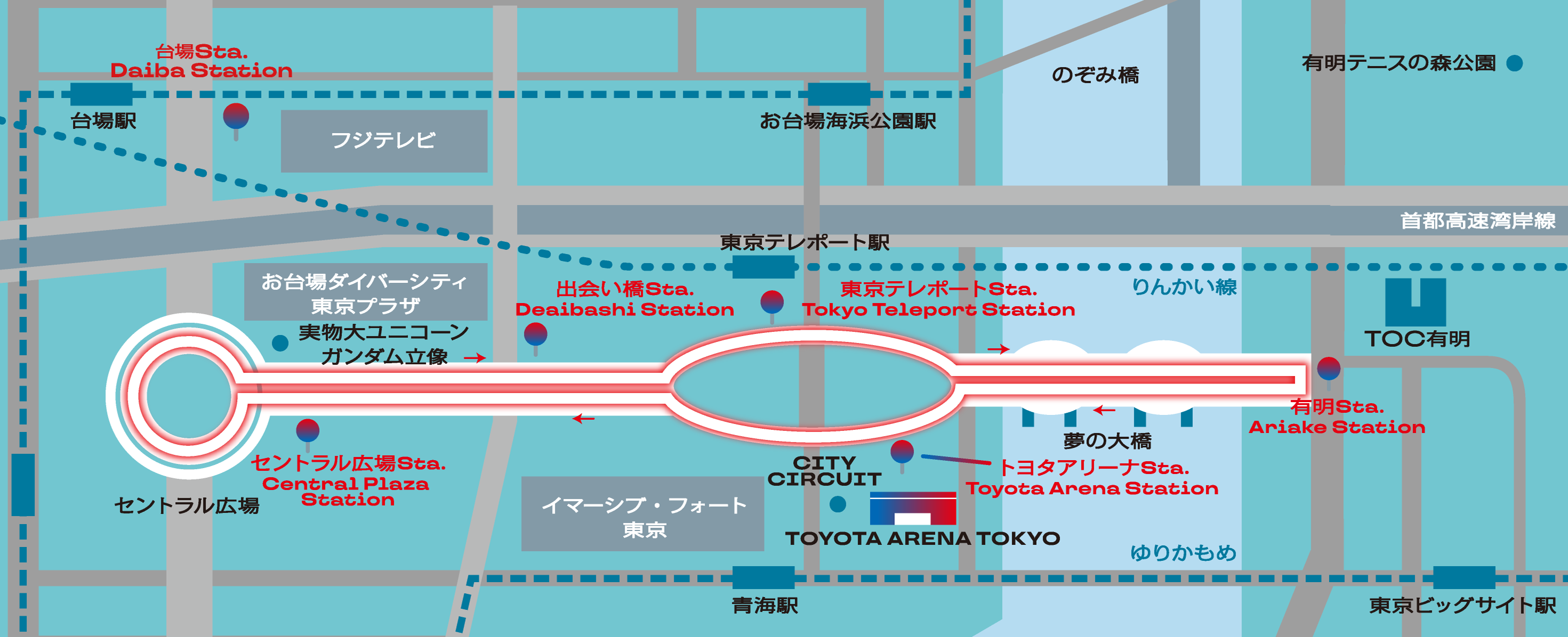東京テレポートSta.→有明Sta.(夢の大橋有明側)→トヨタアリーナSta.→セントラル広場Sta.(実物大ユニコーンガンダム立像向かい)→東京テレポートSta.